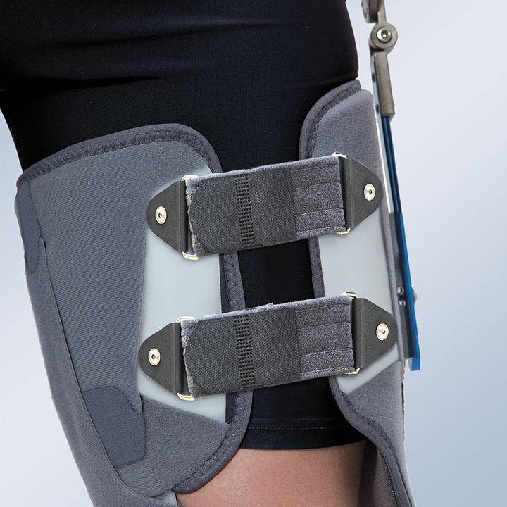 Ortesis estabilizadora de cadera modular que puede ser utilizada indistintamente para la cadera izquierda o derecha. Fabricada en polietileno de baja densidad. Compuesta por una banda pélvica y una muslera (ambas bivalvas), unidas entre si por una articulación regulable en flexo-extensión de 0° a 80° en intervalos de 20° y en abducción, en las posiciones de 0°, 20° y 40°. Los cierres de la muslera están compuestos por dos cinchas con cierre de velcro.